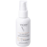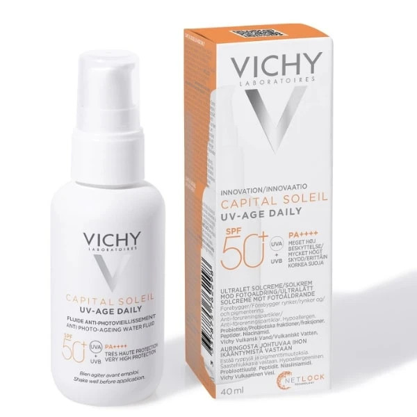 ضد آفتاب ویشی ضد چروک بدون رنگ مدل پمپی از سری محصولات برند ویشی و دارای فرمول محافظتی پیشرفته در برابر طیف وسیع اشعه های UVA/UVB است. به دلیل وجود اجزاء فعال پوستی قدرتمند و فناوری Netlock، فلوئید ضد آفتاب و جوانساز +SPF50 کاپیتال سولیل ویشی (Vichy Capital Soleil UV Age Daily SPF50+ Facial Sunscreen) نه تنها از پوست شما مراقبت می کند بلکه باعث تقویت سد پوستی نیز می شود. این ضدآقتاب فلوئیدی آبکی، جلوی بروز چین و چروک، لکه و تیرگی ایجاد شده در اثر نور آفتاب را می گیرد.