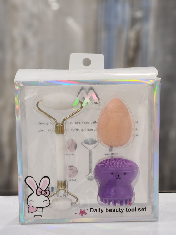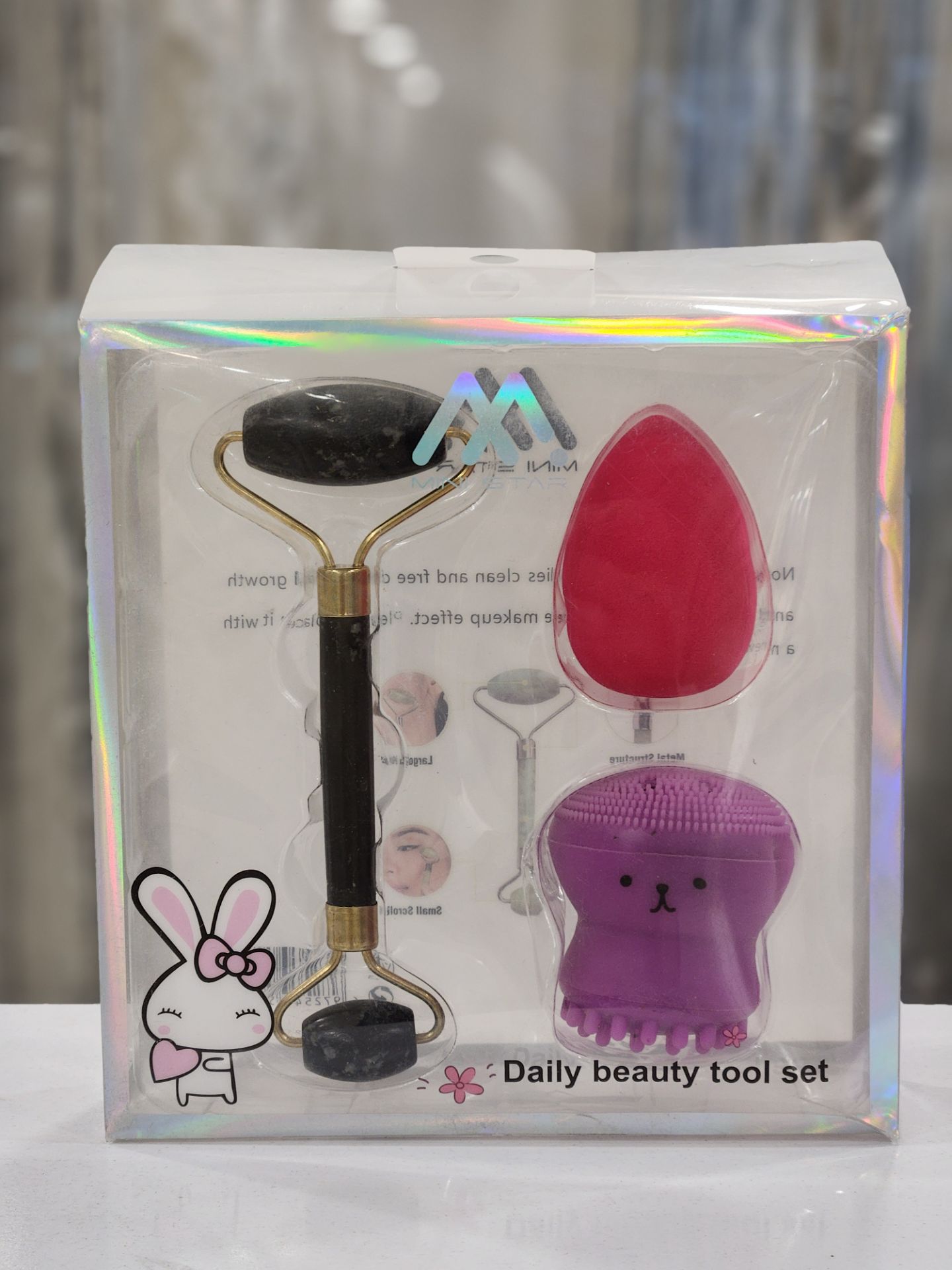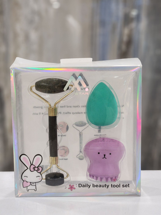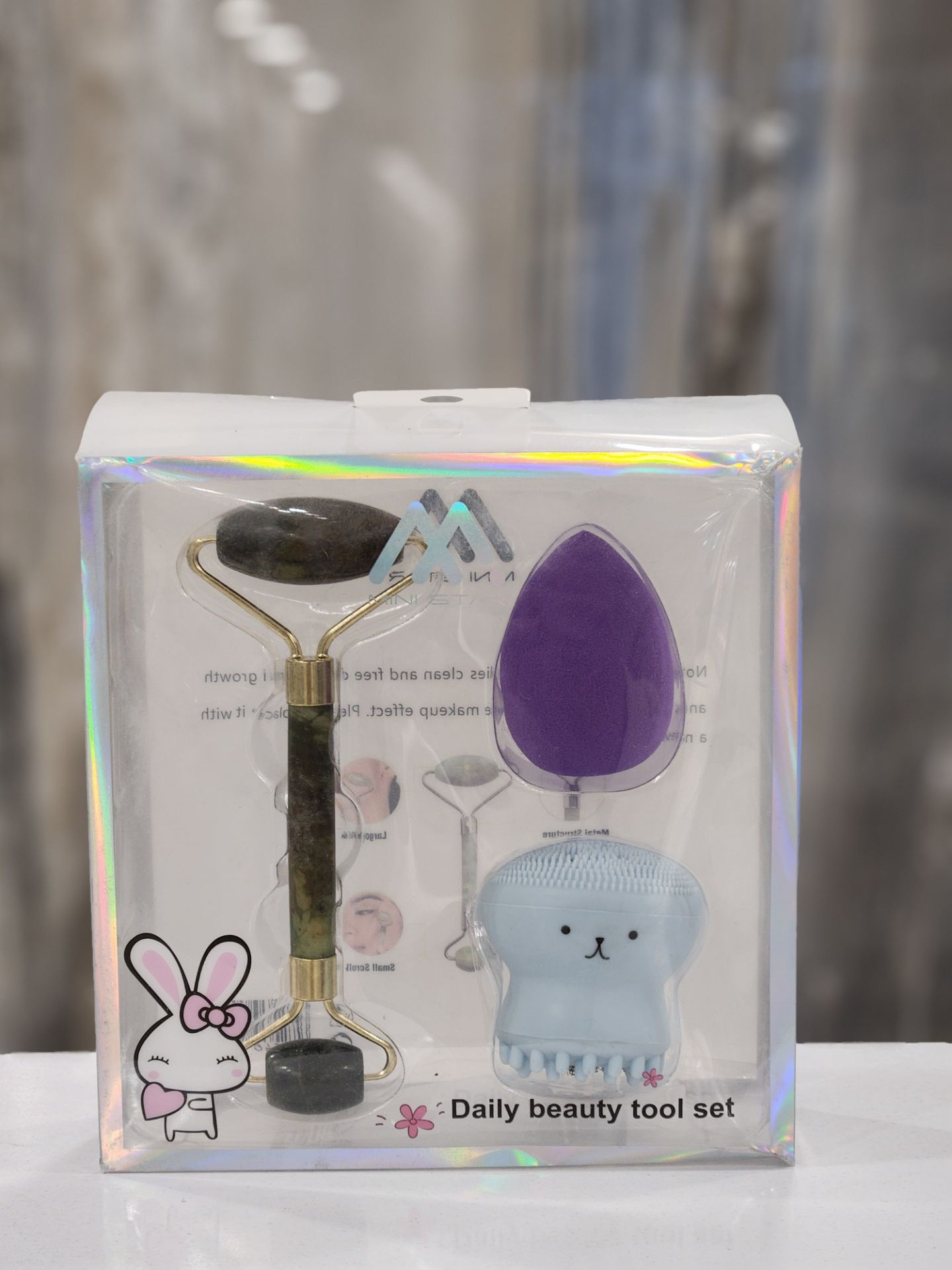 این ست شامل پد آرایشی نرم (بیوتی بلندر)، فیس براش سیلیکونی دو طرفه، جیدرولر دوسر بزرگ و کوچک از جنس سنگ یشم طبیعی، و یک براش ماسک است.